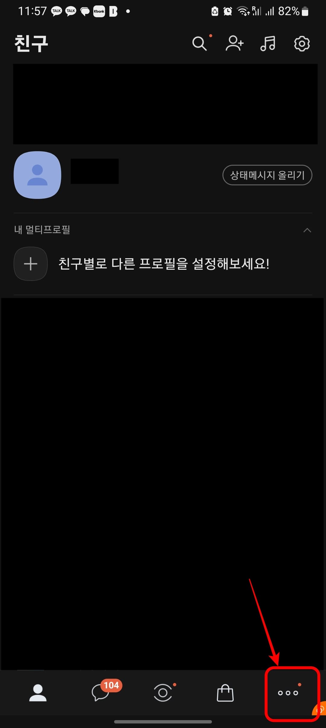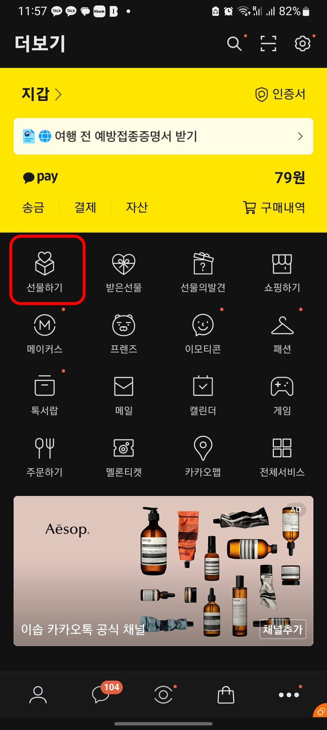 카카오톡 어플을 실행하면 홈화면 우측 하단에서 점 3개 아이콘을 터치합니다. 더보기 메뉴가 표시되면 중아에서 선물하기 아이콘을 터치합니다.
