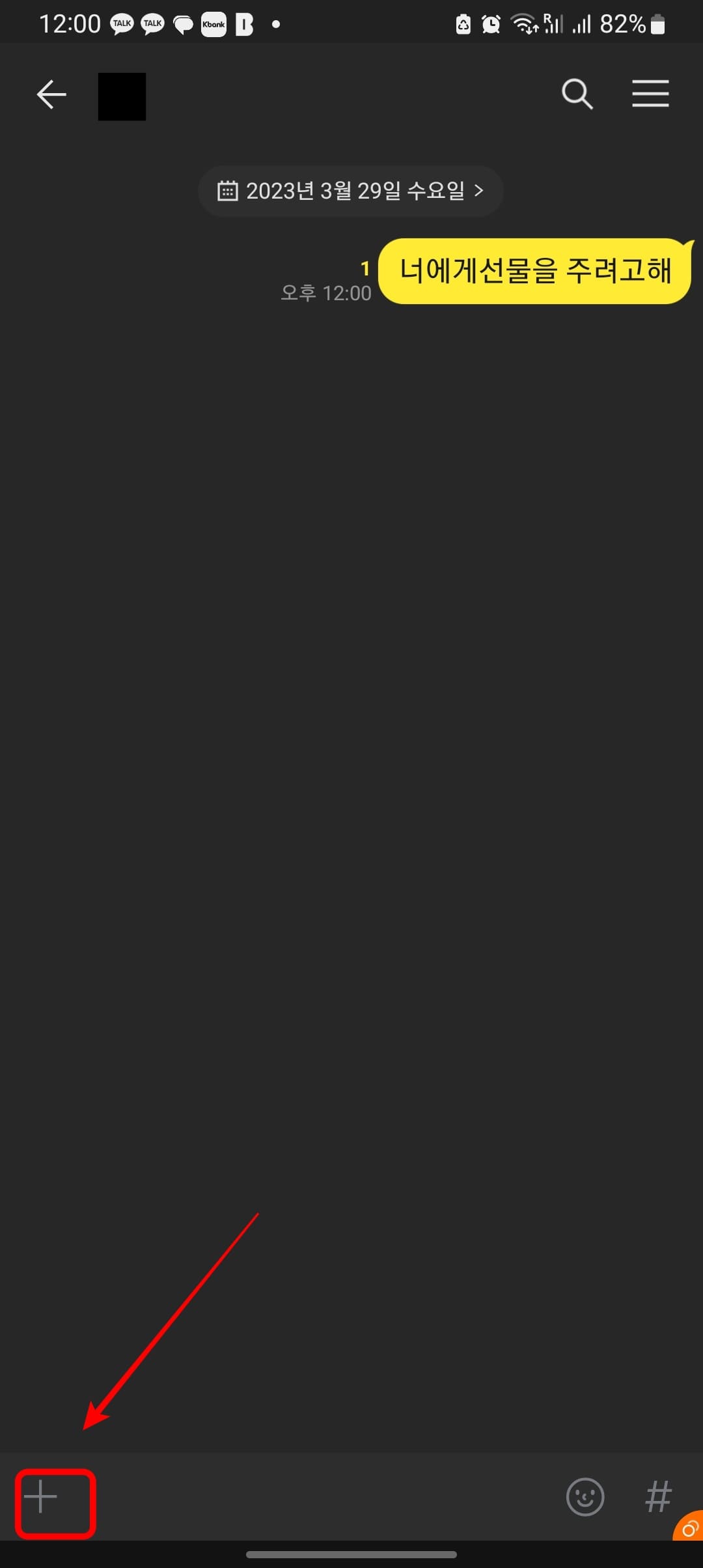 카톡에서는 채팅방에서 바로 선물하기가 가능합니다. 채팅창 하단에 + 버튼을 터치합니다. 표시되는 메뉴 중 선물하기 메뉴를 터치합니다.