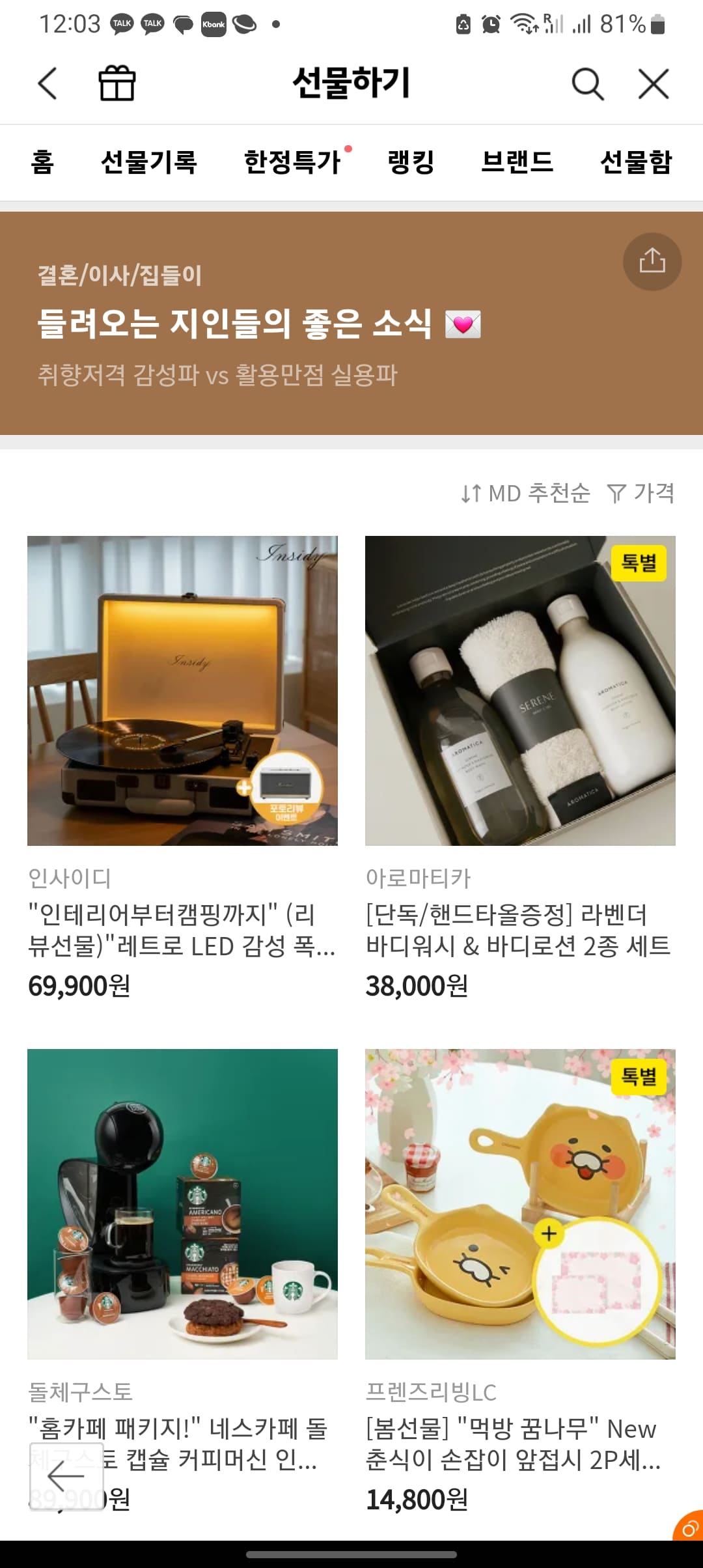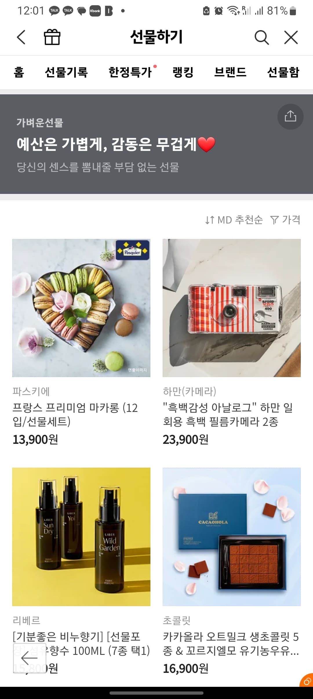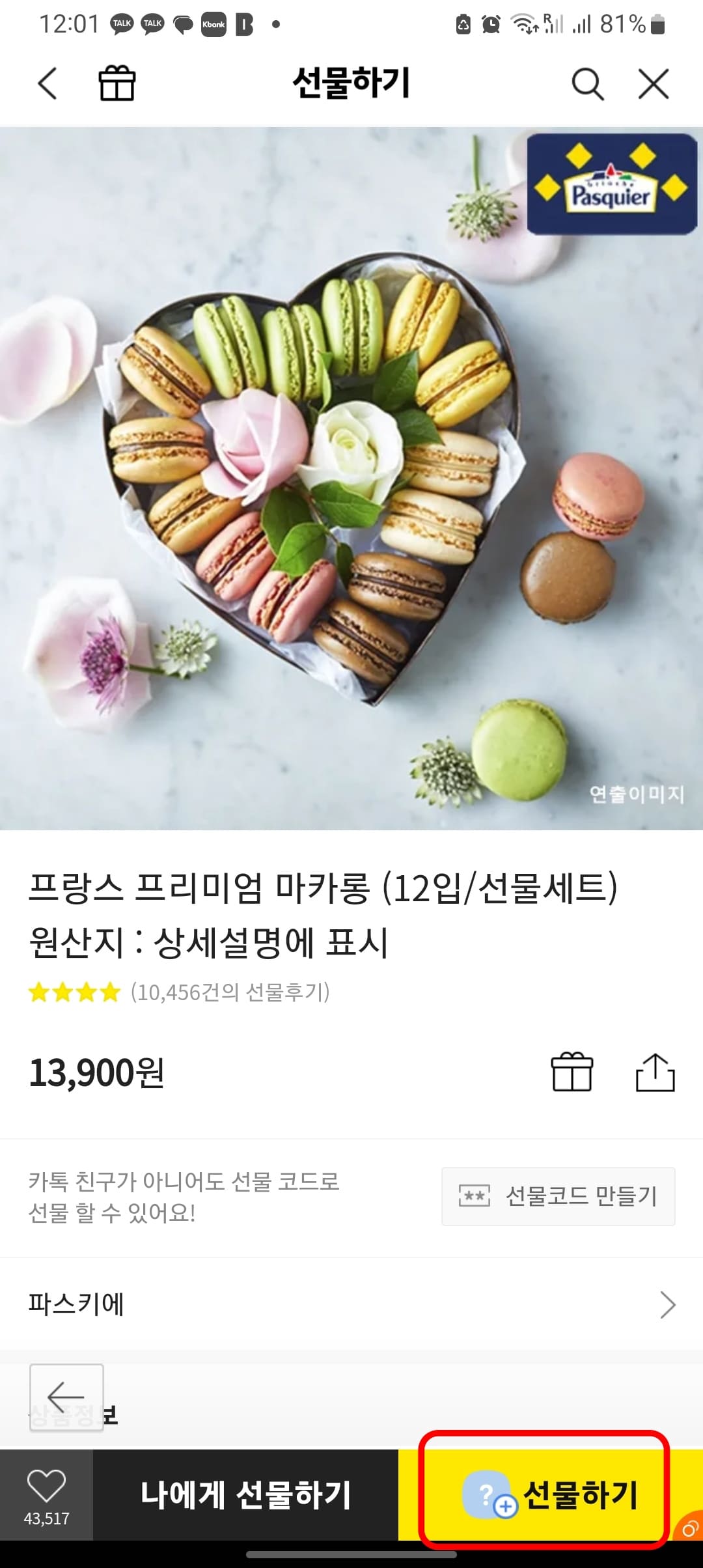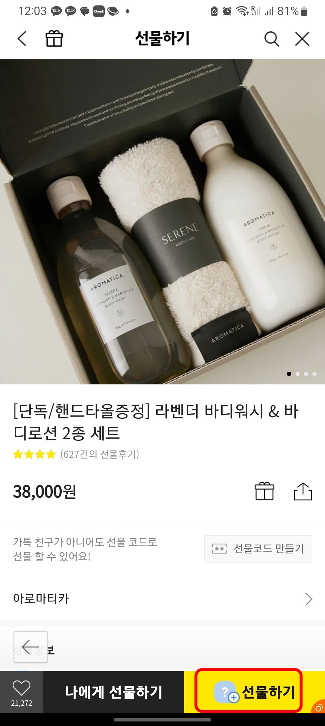 마음에 드는 선물을 선택합니다. 하단에서 선물하기 버튼을 터치하고 위와 같은 방법으로 진행합니다.