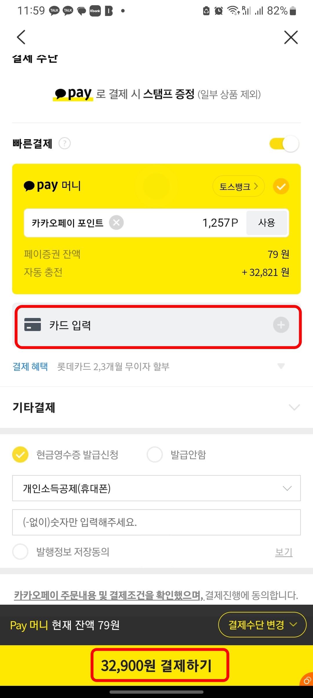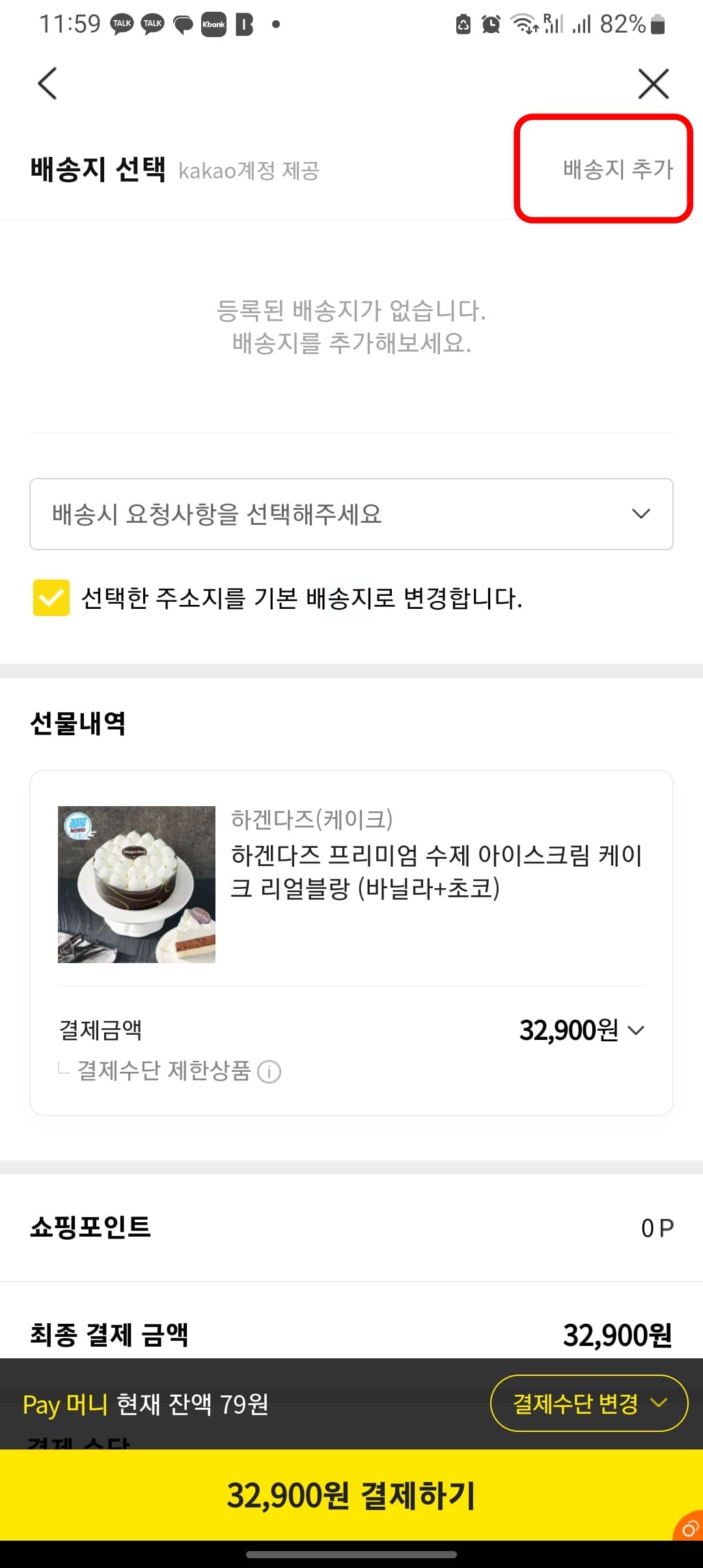 이후 배송지 추가를 터치하여 상품 수령이 가능한 친구의 주소를 입력합니다. 카카오페이 또는 카드입력으로 결제 방법을 선택하고 하단에서 결제하기 버튼을 터치하면 선물 보내기가 완료됩니다.