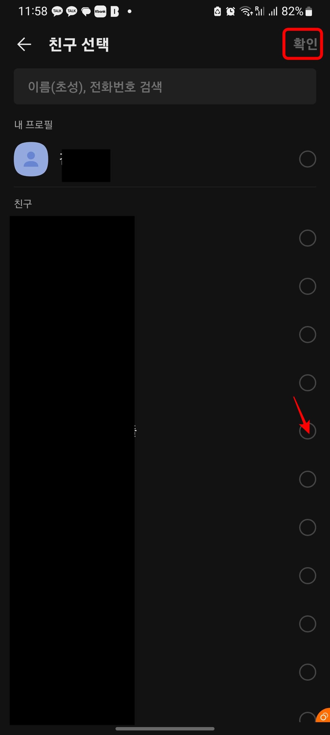 선물할 친구를 지정하려면 우측 상단의 친구 선택 아이콘을 먼저 터치합니다. 친구 목록이 표시되면 선물할 친구의 닉네임 우측에서 체크 표시를 한 뒤 상단의 확인 버튼을 터치합니다.