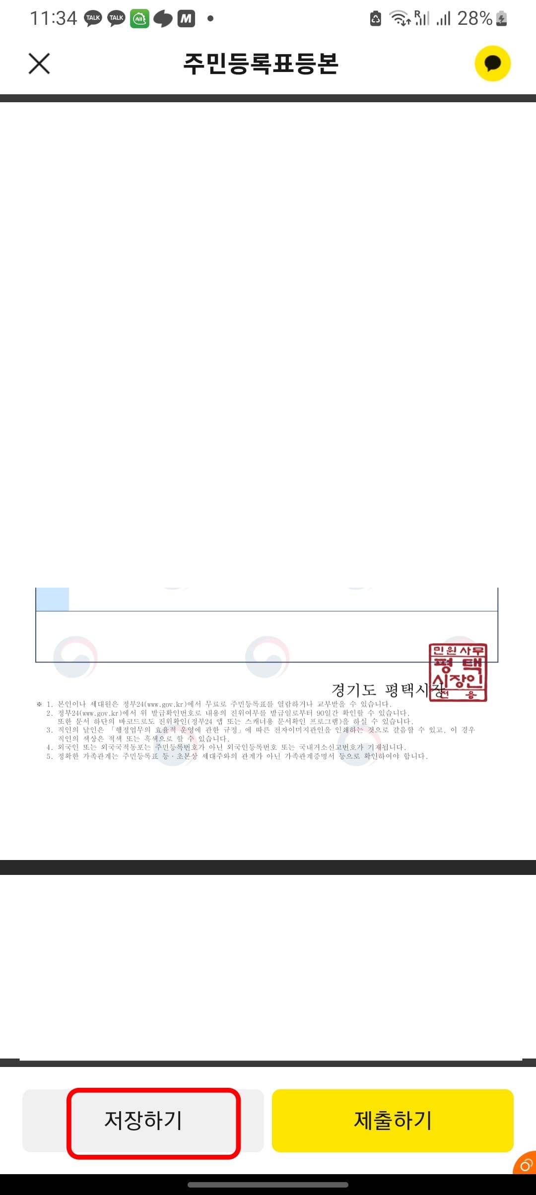 잠시만 기다려주세요라는 메시지가 표시되면 주민등록등본이 발급되는 중이라는 뜻입니다. 주민등록등본이 표시되면 하단의 저장하기 버튼을 터치하여 휴대폰에 문서를 저장합니다.