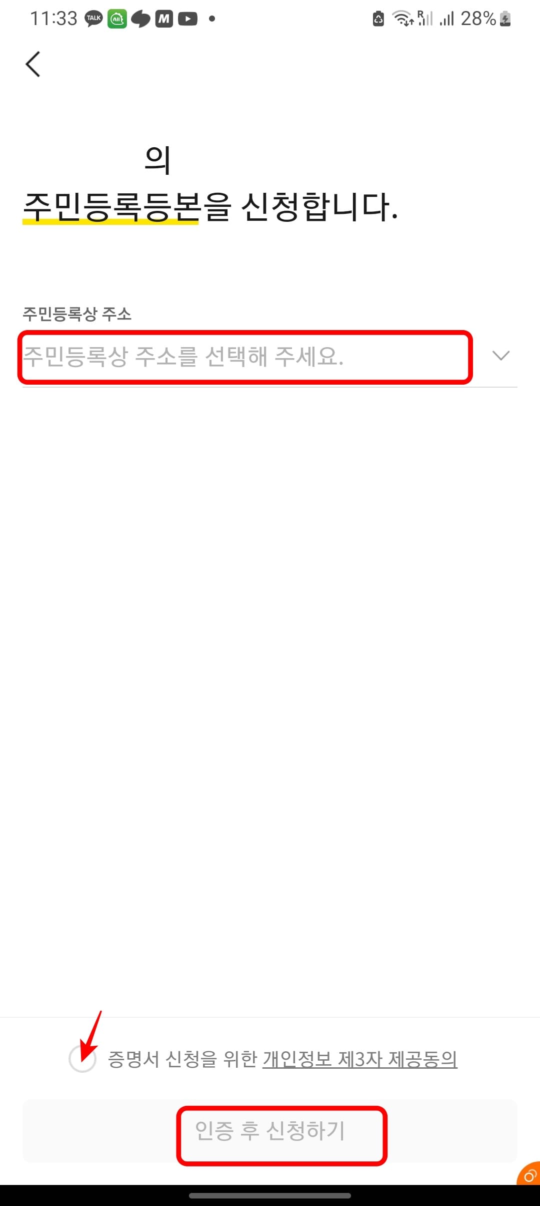 주민등록상의 주소를 선택하시고 하단의 증명서 신청을 위한 개인정보 제공동의를 체크한 뒤 주민등록등본의 발급 형태를 선택하시고 인증 후 신청하기 버튼을 터치합니다.