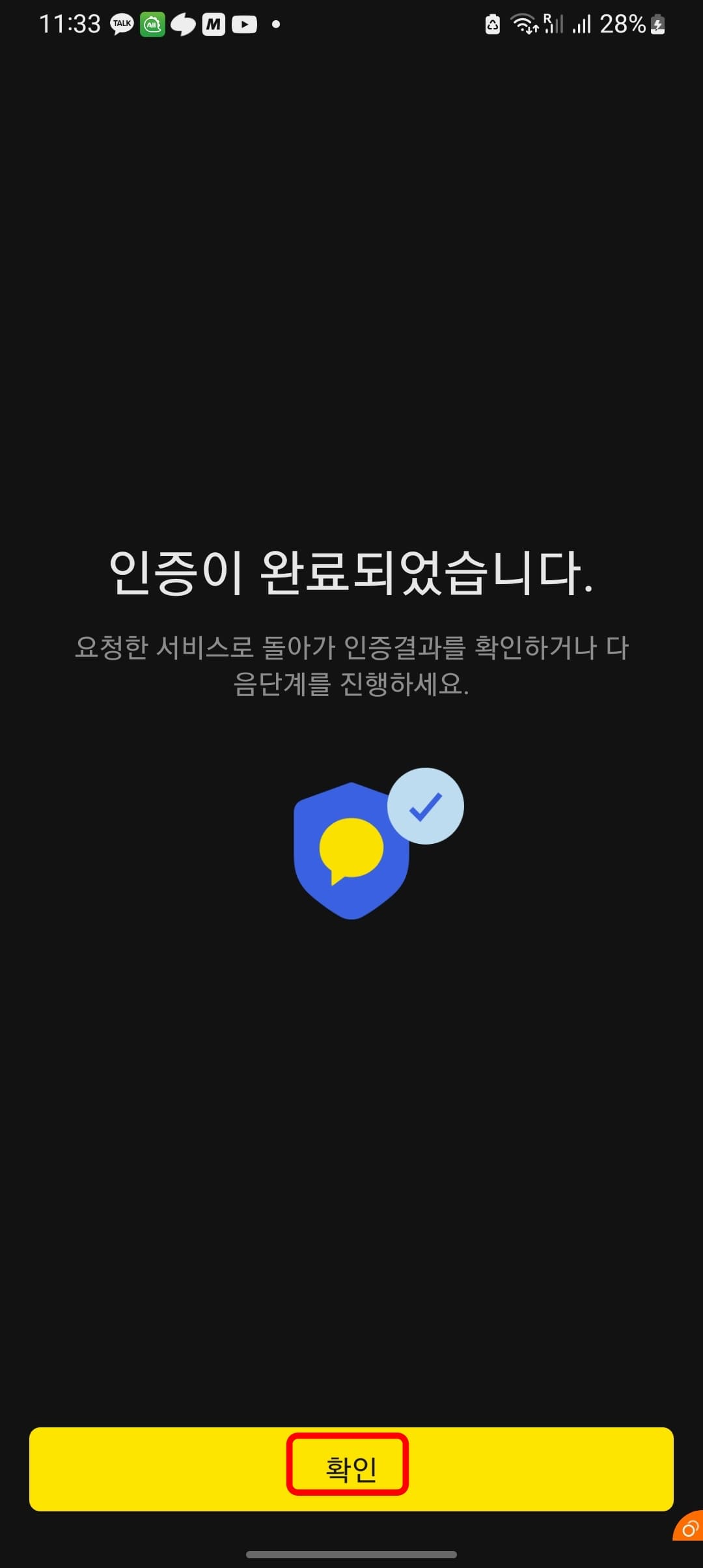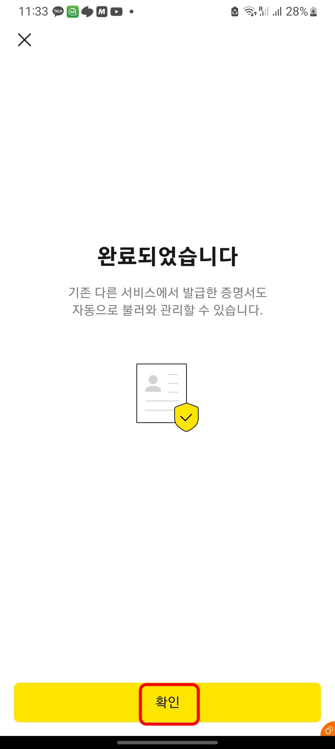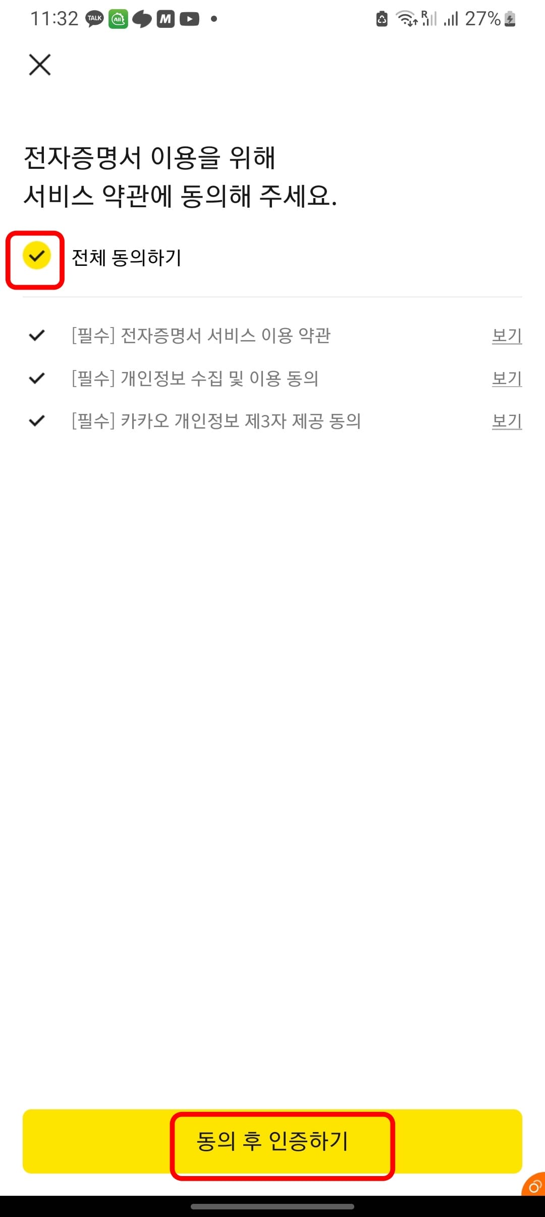 서비스 이용 약관에 전체 동의하기를 체크하고 하단의 동의 후 인증하기 버튼을 터치합니다. 이후 6자리의 인증서 비밀번호를 입력하면 인증이 완료되었다고 표시됩니다. 하단의 확인버튼을 터치합니다.