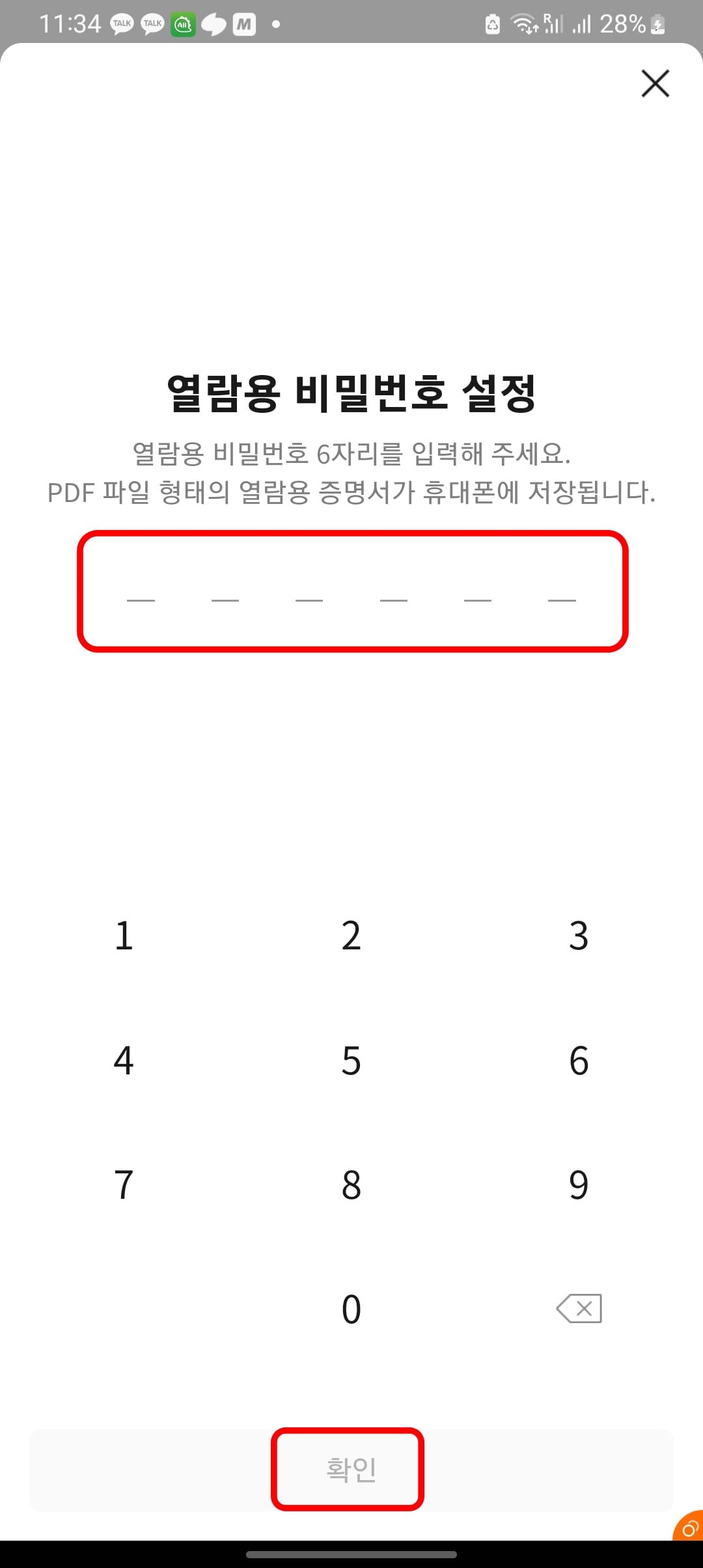 PDF 파일 형태의 열람용 증명서의 비밀번호를 설정합니다. 6자리의 비밀번호를 지정하면 열람시 비밀번호 입력을 통해 문서를 확인할 수 있습니다.